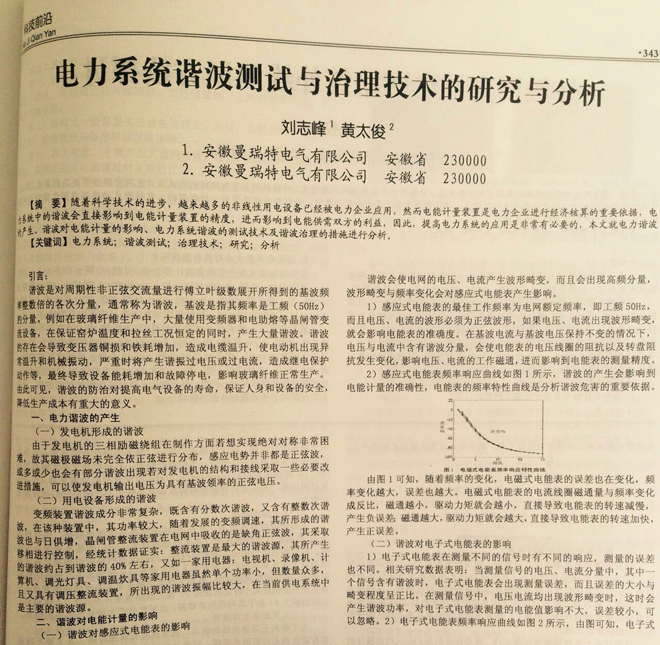 2015年5月,我公司技術(shù)中心劉志峰和黃太俊工程師的一篇關(guān)于諧波治理的論文在國家級(jí)學(xué)術(shù)期刊《信息周刊》上發(fā)表 ,該文章闡述了電力系統(tǒng)中諧波的產(chǎn)生原因以及目前國內(nèi)外主流的監(jiān)測(cè)技術(shù)并給出了合理的治理方案,對(duì)行業(yè)的交流及產(chǎn)品提升有著重要的意義。